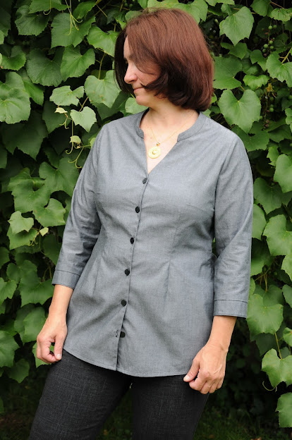 Ich habe mich bei meiner Azora für die 3/4 Arm-Variante mit Stehkragen aus Chambray entschieden und die Blusenlänge einfach um 10 cm verlängert. So habe ich eine schicke Bluse, die ich aber offen getragen auch super über meine Raffaelle tragen kann.